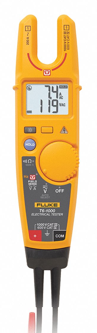 Fluke t5 1000 open jaw electrical tester 1000v 93086 checks voltage continuity and current with one compact tool.